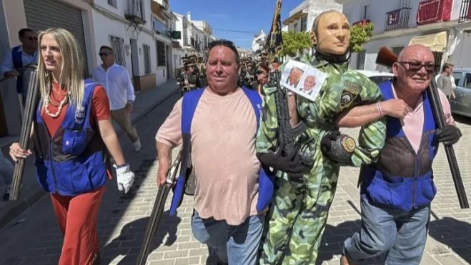 La localidad sevillana de Coripe ha celebrado un año más su tradicional quema de Judas, una costumbre centenaria que en esta ocasión ha tenido como figura principal al presidente ruso, Vladímir Putin. El muñeco, colgado de un árbol, fue tiroteado, golpeado y finalmente quemado ante la presencia de vecinos y visitantes, siguiendo el ritual habitual de esta festividad.