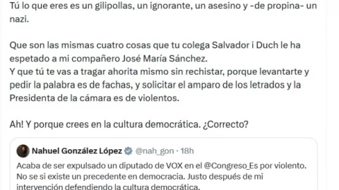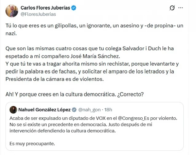 El diputado valenciano del partido de Santiago Abascal, Carlos Flores, ha usado su cuenta en la red social X para llamar "gilipollas" y "nazi" al parlamentario de Sumar, Nahuel González, alegando que esos fueron los insultos recibidos de la bancada de Esquerra por su compañero expulsado.